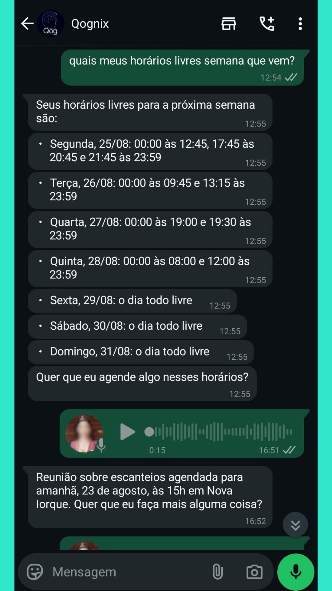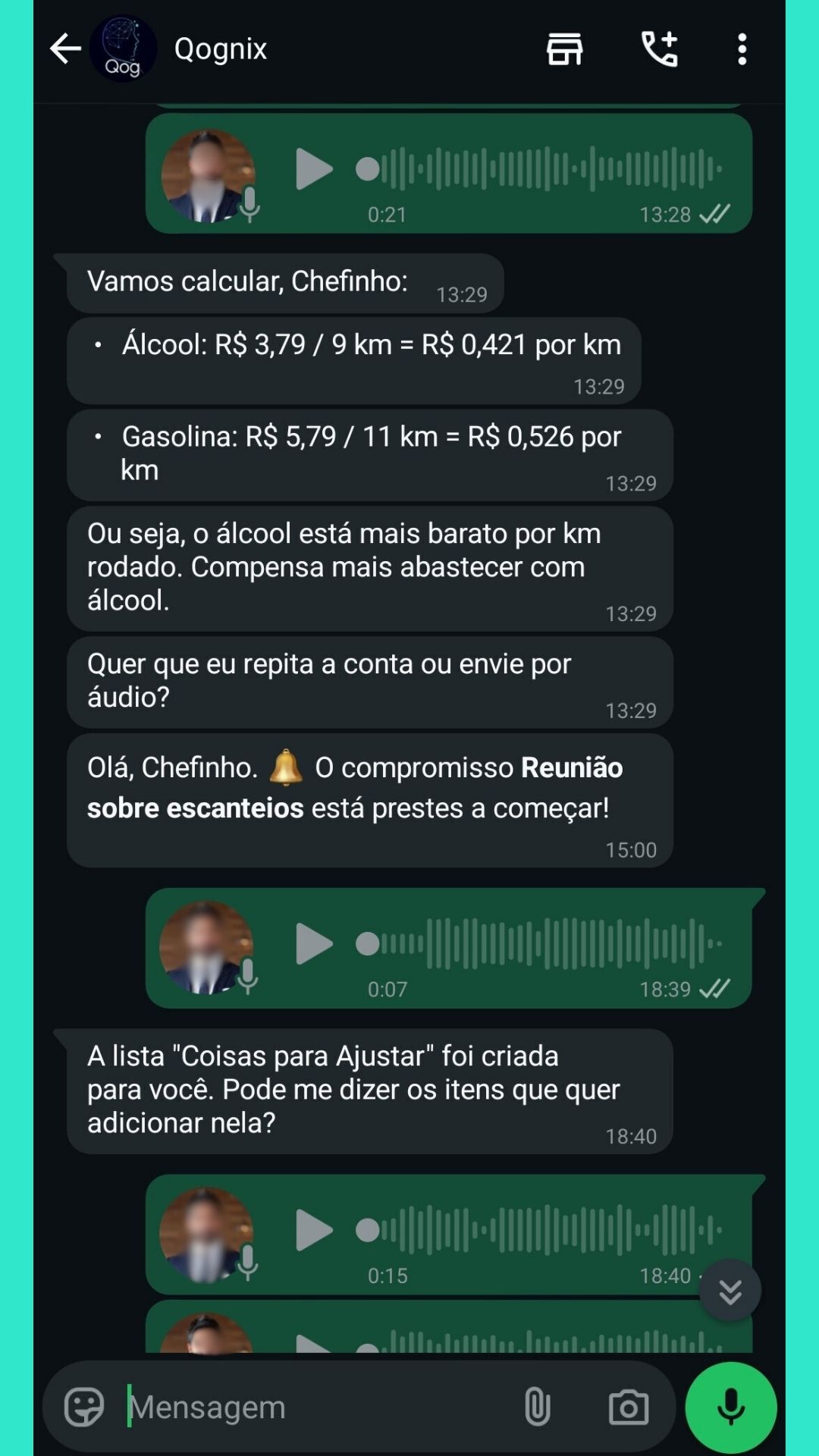 Atualmente a Qog apenas lhe responde via voz ou texto dentro do Whatsapp. Mas em breve ela estará fazendo chamadas telefônicas para enviar recados ☺️